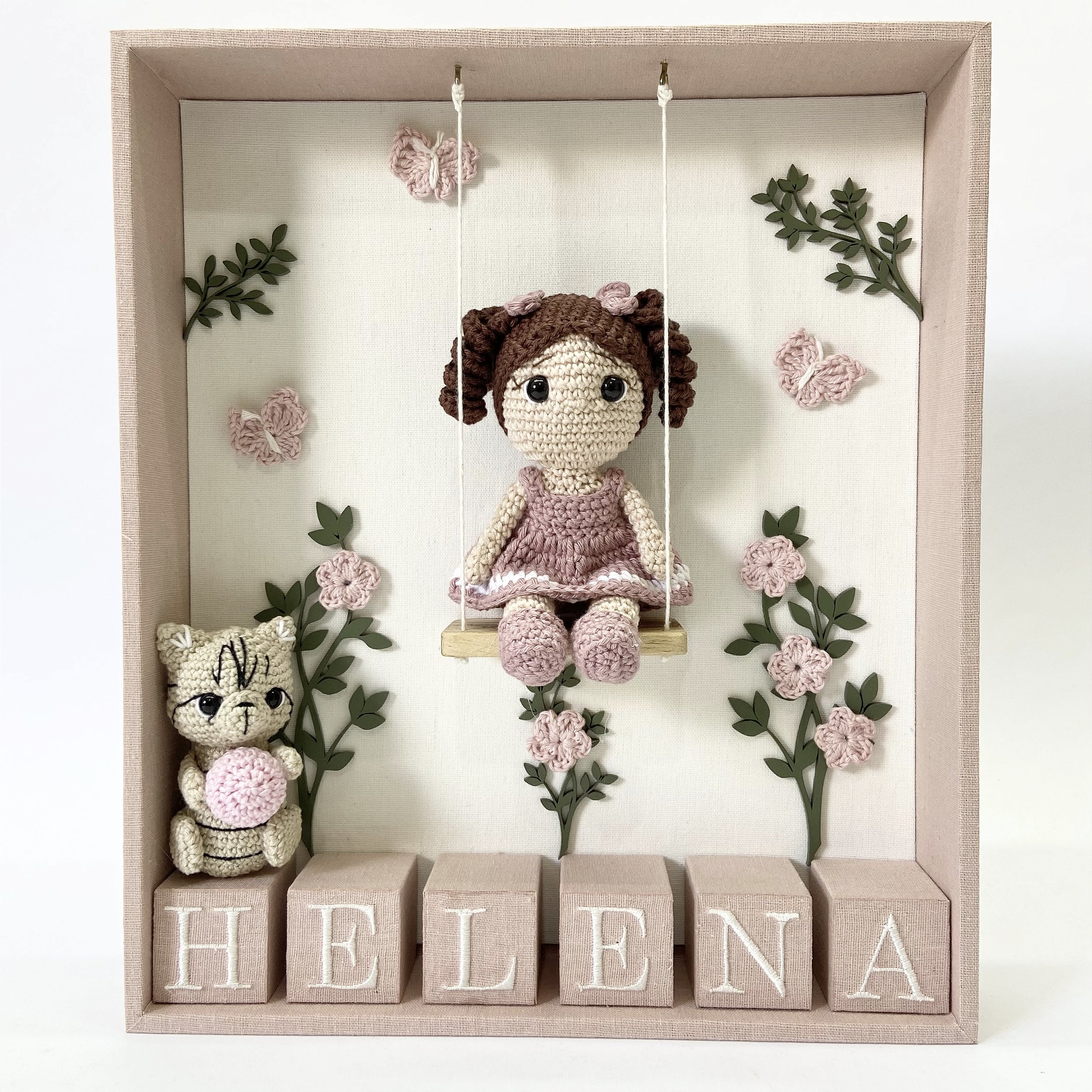 Porta maternidade artesanal confeccionado à mão com técnica de amigurumi. Composto por bonequinha no balanço, ursinho, flores e borboletas decorativas, formando uma cena delicada e harmoniosa.